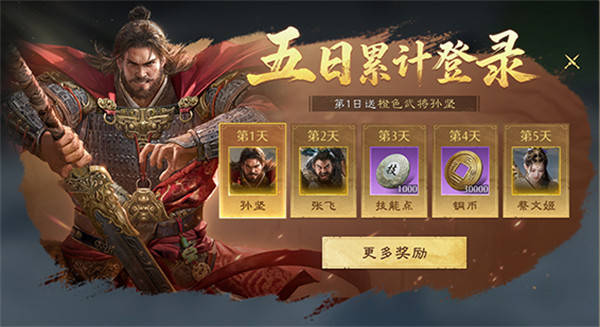累计登录5天: 免费获得4位传说橙将:孙策、孙坚、张飞、蔡文姬。