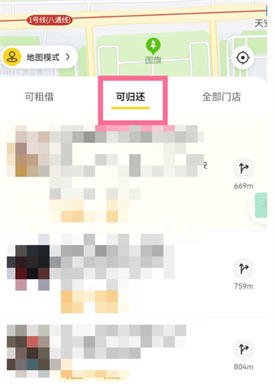 3、进入 附近门店 后,点击 可归还,即可看到离我们最近的门店。