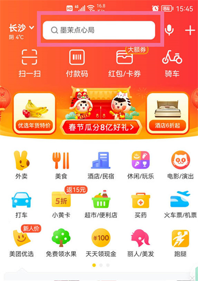 1、我们打开 美团 软件,点击首页上方的 搜索框,输入关键词。