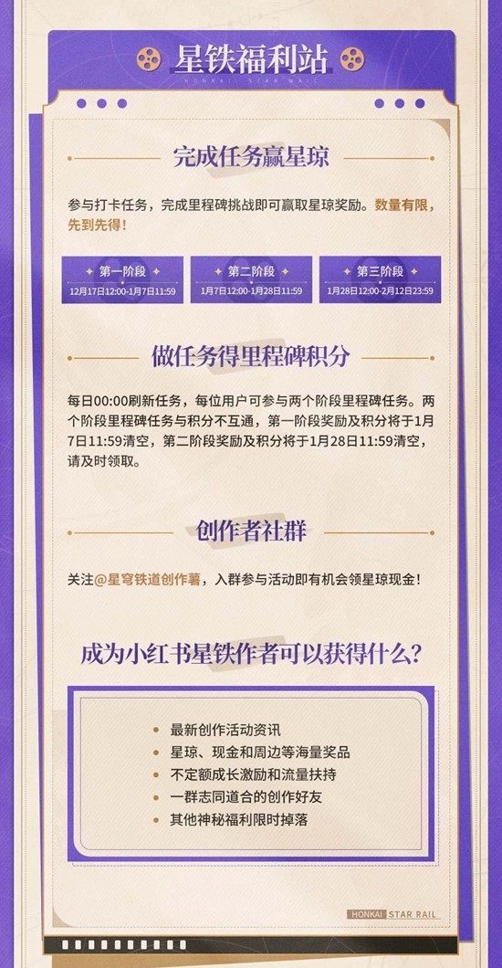 在小红书平台,带话题 #崩坏星穹铁道 和 #崩坏星穹铁道创作者激励计划,发布 《崩坏:星穹铁道》 原创作品,即可参与活动,赢取 现金红包、游戏星琼 等奖励。