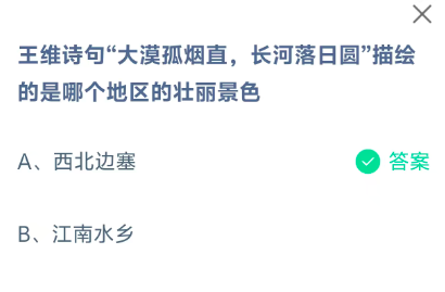 王维诗句“大漠孤烟直,长河落日圆”描绘的是哪个地区的壮丽景色?这是今天《支付宝》每日一题的问题,相信我们很多用户都很想知道这个问题的答案是什么?这么一个可以领取饲料的机会相信我们很多用户都不想错过,这里指玩手游网的小编为你带来了2025《支付宝》12月26日每日一题最新答案介绍(1)的全部内容,喜欢的小伙伴欢迎点击进入看看吧。