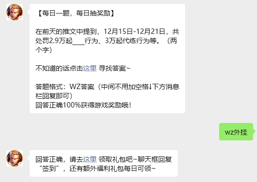 今日问题:在前天的推文中提到,12月15日-12月21日,共处罚2.9万起____行为、3万起代练行为等。(两个字)