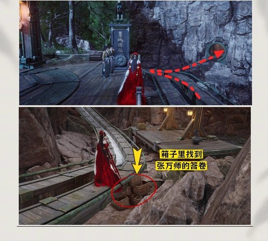 2、传送至遗璜径,乘坐云槎或沿轨道进入山洞,在箱子中搜集张万师的答卷,返回浮英野交给何万道,完成任务。