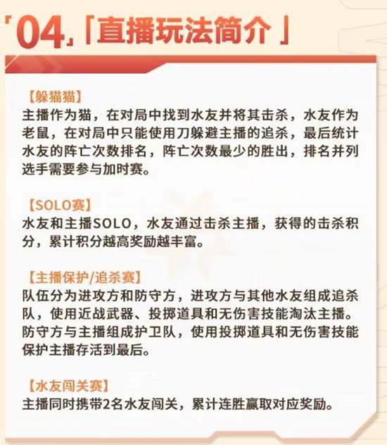 躲猫猫:主播当“猫”持刀追杀,水友仅能用匕首躲藏,阵亡最少者胜;平局加赛