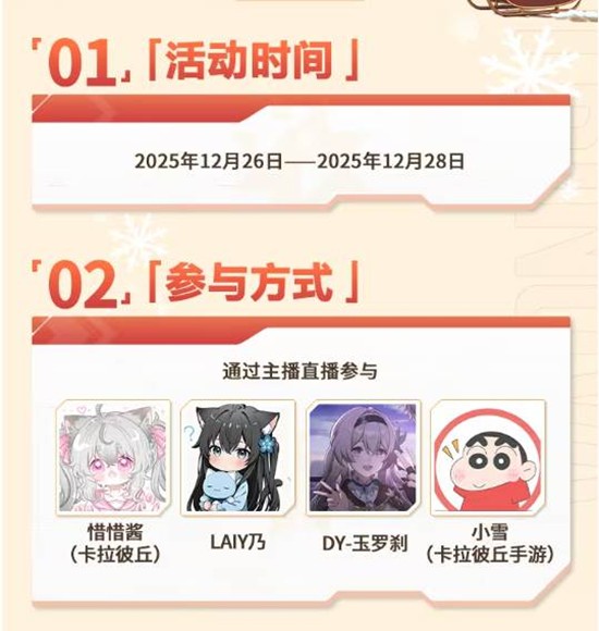 卡拉彼丘圣诞节直播嘉年华12月26日至28日连开三天,官方携六大主播把“冬日战场”搬上直播间,玩家们可以直播间边看操作边领取大量游戏奖励,那么现在就让指玩手游网的小编为大家带来关于卡拉彼丘圣诞节直播嘉年华来袭的全部内容吧,感兴趣的小伙伴一定不要错过哦。