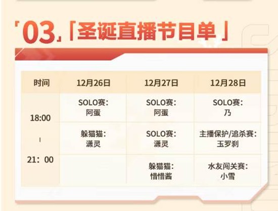 12/28 18:00 SOLO赛(乃)→21:00 主播保护/追杀赛(玉罗刹)