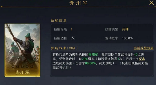 【青州军】:兵种技能,提供额外反击次数和统率,增减伤一体,枪兵反击必备。