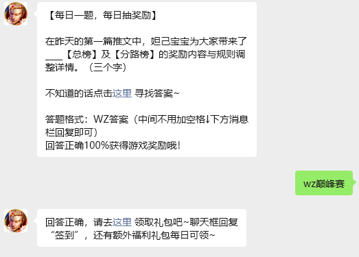 今日问题:在昨天的第一篇推文中,妲己宝宝为大家带来了____【总榜】及【分路榜】的奖励内容与规则调整详情。(三个字)