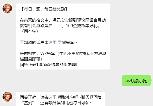 今日问题:在前天的推文中,妲己宝宝提到评论区留言互动就有机会赢取桑启-____、100企鹅币等好礼。(四个字)
