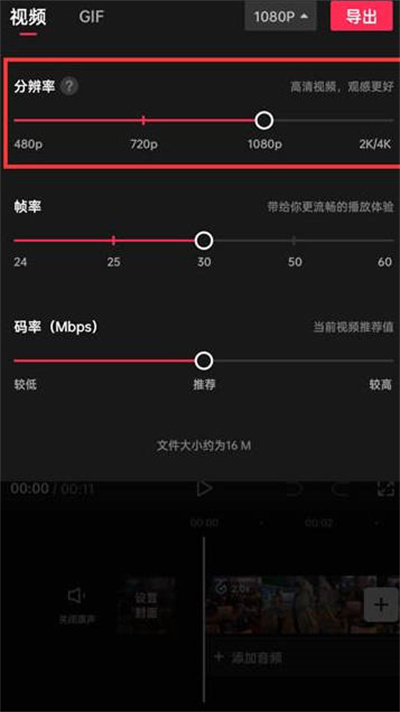 在清晰度设置中,可调整分辨率、帧率和码率。数值越高,视频文件占用越大。