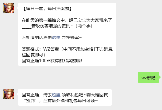 今日问题:在昨天的第一篇推文中,妲己宝宝为大家带来了_____普攻伤害增强的资讯~(两个字)