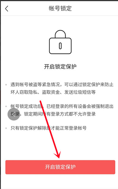 5、在账号锁定页面,点击“开启锁定保护”,完成验证即可。