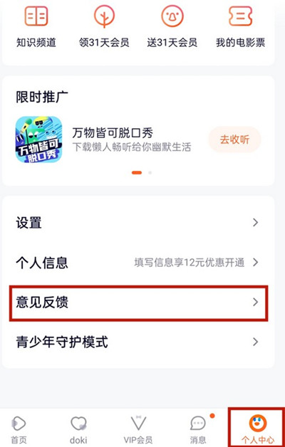 1、打开 腾讯视频 → 我的 → 意见反馈,