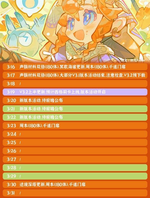2、V3.2 小版本过渡:只公布一个新角色立绘,下半版本少一周,为周年庆预留空间,不急着抽西格莉卡的可以先攒资源。