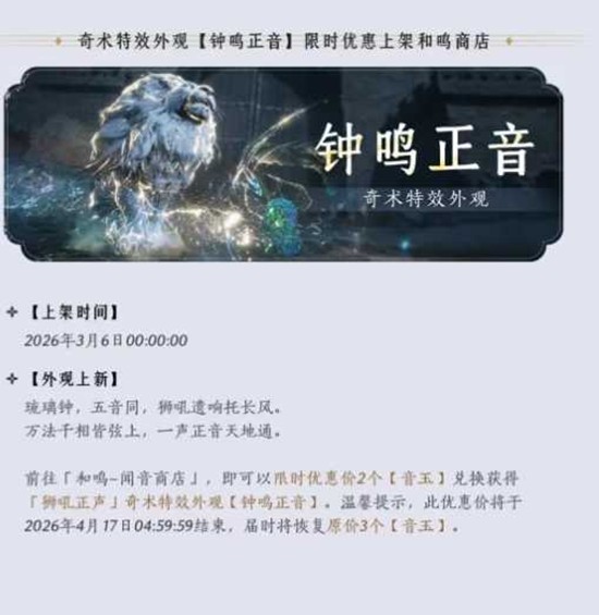《燕云十六声》声震山河,正音涤荡!《燕云十六声》全新奇术特效【钟鸣正音】今日(3月6日)正式上架!专为“狮吼正声”打造,限时仅需2个音玉即可兑换,让游侠们的佛门狮子吼更具天地共鸣之威!现在就让指玩手游网的小编为大家带来关于《燕云十六声》钟鸣正音今日将登场的全部内容吧,感兴趣的小伙伴一定不要错过。