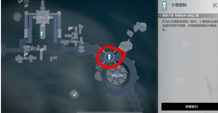 传送至右上角小型信标-联结之塔,抬头飞往正上方小岛。