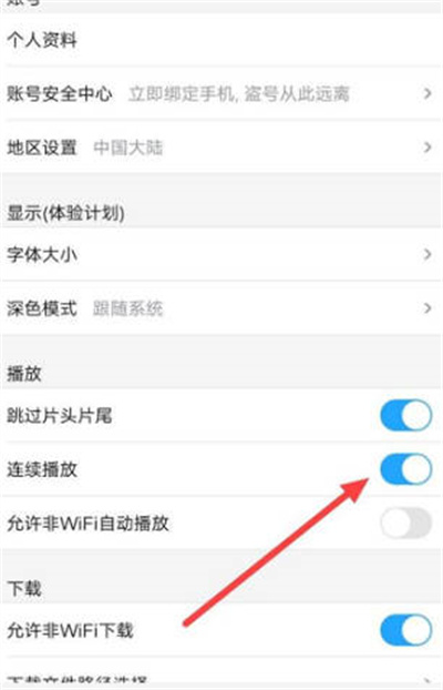 进入设置后,找到连续播放,把右侧滑块关闭即可。