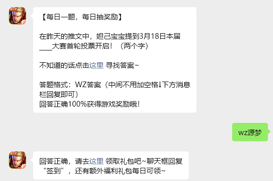 在昨天的推文中,妲己宝宝提到3月18日本届____大赛首轮投票开启!(两个字),玩家只需要回答对今日的问题,即可获取游戏奖励,那么答案到底是什么呢?现在就让指玩手游网的小编为大家带来关于2026《王者荣耀》3月18日每日一题答案介绍的全部内容吧,感兴趣的小伙伴一定不要错过哦。
