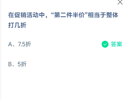 在促销活动中,“第二件半价”相当于整体打几折?是今天《支付宝》每日一题的问题,相信我们很多用户都很想知道这个问题的答案是什么?这么一个可以领取饲料的机会相信我们很多用户都不想错过,这里指玩手游网的小编为你带来了2026《支付宝》3月19日每日一题最新答案介绍(2)的全部内容,喜欢的小伙伴欢迎点击进入看看吧。