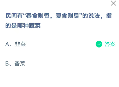 民间有“春食则香,夏食则臭”的说法,指的是哪种蔬菜?这是今天《支付宝》每日一题的问题,相信我们很多用户都很想知道这个问题的答案是什么?这么一个可以领取饲料的机会相信我们很多用户都不想错过,这里指玩手游网的小编为你带来了2026《支付宝》3月24日每日一题最新答案介绍(1)的全部内容,喜欢的小伙伴欢迎点击进入看看吧。