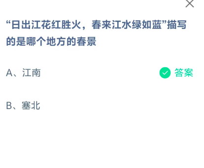 “日出江花红胜火,春来江水绿如蓝”描写的是哪个地方的春景?是今天《支付宝》每日一题的问题,相信我们很多用户都很想知道这个问题的答案是什么?这么一个可以领取饲料的机会相信我们很多用户都不想错过,这里指玩手游网的小编为你带来了2026《支付宝》3月24日每日一题最新答案介绍(2)的全部内容,喜欢的小伙伴欢迎点击进入看看吧。