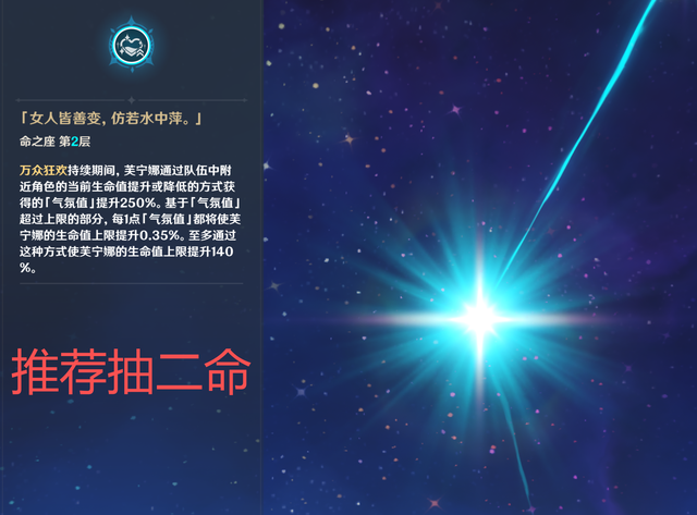 有条件的建议至少抽到2命,没条件的至少抽个0命,真的是百搭好用。再往上的高命座就不多推荐了,平民够不着,氪佬自由发挥。