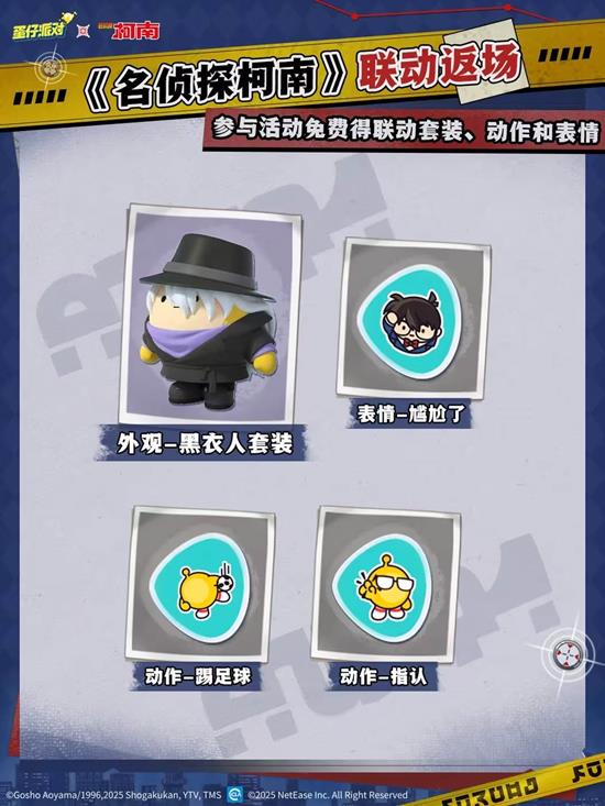 此外,参与活动还能免费获取黑衣人套装及多种动作表情。侦探冒险再次升级,快来蛋仔岛揭开谜团、收集限定奖励吧!