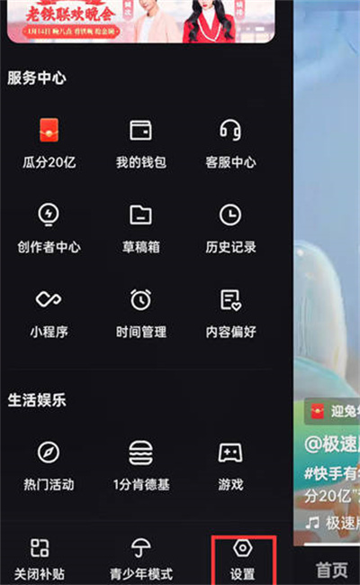 1、打开快手软件,然后点击左上角的三条横线,接着点击下方的“设置”功能。