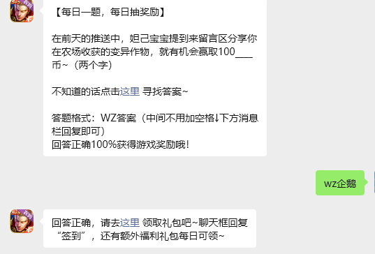 在前天的推送中,妲己宝宝提到来留言区分享你在农场收获的变异作物,就有机会赢取100____币~(两个字)
