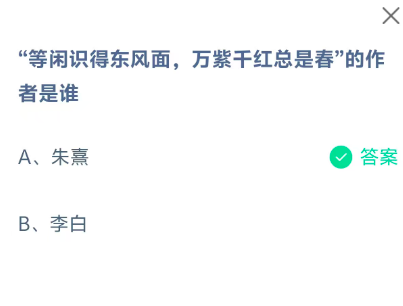 “等闲识得东风面,万紫干红总是春"的作者是谁?这是今天《支付宝》每日一题的问题,相信我们很多用户都很想知道这个问题的答案是什么?这么一个可以领取饲料的机会相信我们很多用户都不想错过,这里指玩手游网的小编为你带来了2026《支付宝》4月8日每日一题最新答案介绍(2)的全部内容,喜欢的小伙伴欢迎点击进入看看吧。