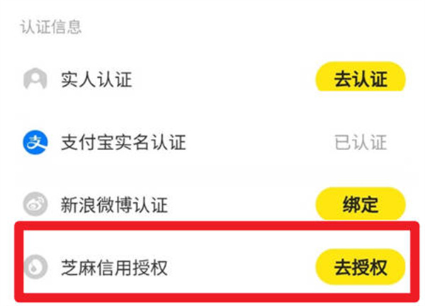 找到「芝麻信用授权」,点击右侧「去授权」,按提示操作即可完成绑定。