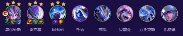 以卑尔维斯为核心输出,搭配雷克塞、阿卡丽、千珏、茂凯、贝蕾亚、剑魔、女警,整体兼顾前排坦度与后排爆发。