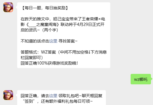 在昨天的推文中,妲己宝宝带来了王者荣耀×电影《____之魔童闹海》联动将于4月29日正式开启的资讯~(两个字),玩家只需要回答对今日的问题,即可获取游戏奖励,那么答案到底是什么呢?现在就让指玩手游网的小编为大家带来关于2026《王者荣耀》4月20日每日一题答案介绍的全部内容吧,感兴趣的小伙伴一定不要错过哦。