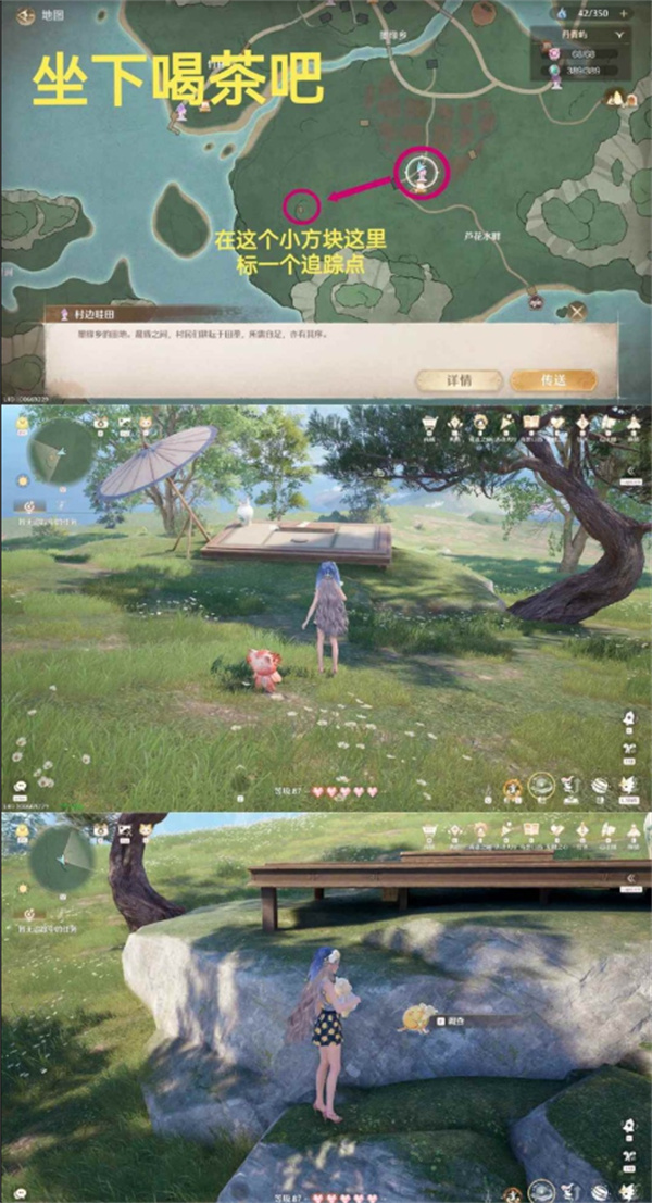 位置:设置追踪点,前往小桌旁,史丢丢正坐在桌子下面,悠闲地品茶。