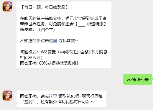 在昨天的第一篇推文中,妲己宝宝提到完成王者荣耀世界任务,可免费领王者【____-极速特派】新皮肤。(四个字)