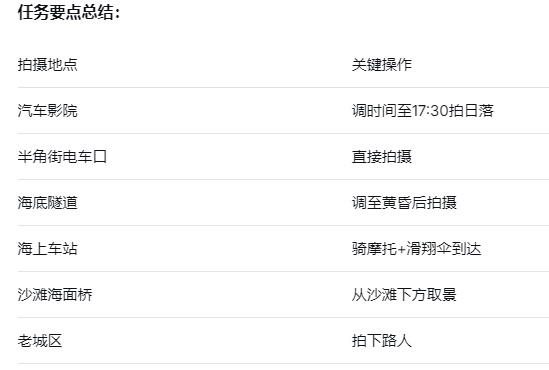 任务完成后,凯西奇要求你前往海上车站拍照。由于位置较远,建议骑小摩托前往。拍照后,再前往沙滩拍摄海面桥景。拍摄完毕后,返回凯西奇交任务。