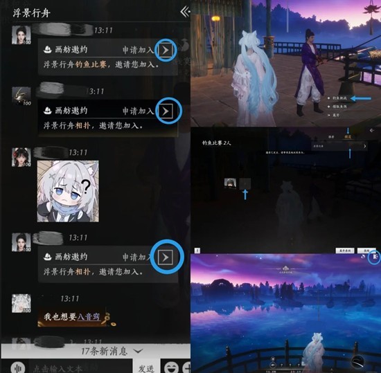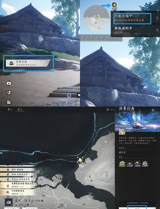 整点参加“行船祈福”活动,上船后挂机约半小时即可刷满情义值。可加速完成的小游戏推荐钓鱼。