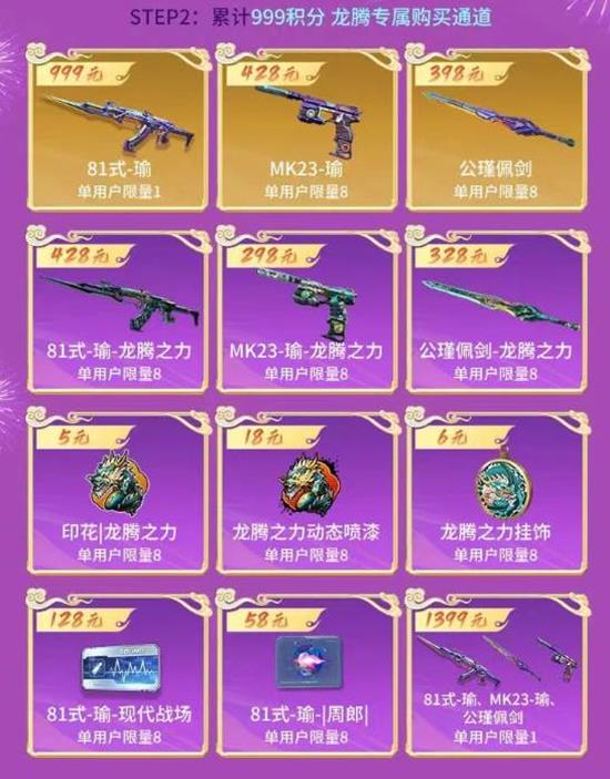 【积分解锁】每消费1元得1点龙腾积分,累计999积分解锁81式-瑜专属购买通道,自由选购81式-瑜系列及万化道具,还有更多福利等你解锁!