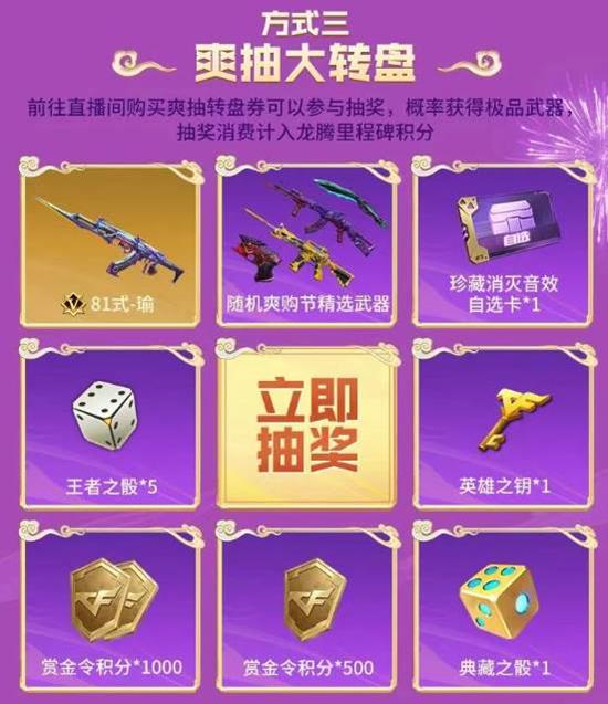 【抽奖玩法】直播间购买爽抽转盘券参与抽奖,赢取极品武器,更有机会一发入魂获得81式-瑜,抽奖消费同样计入龙腾积分!