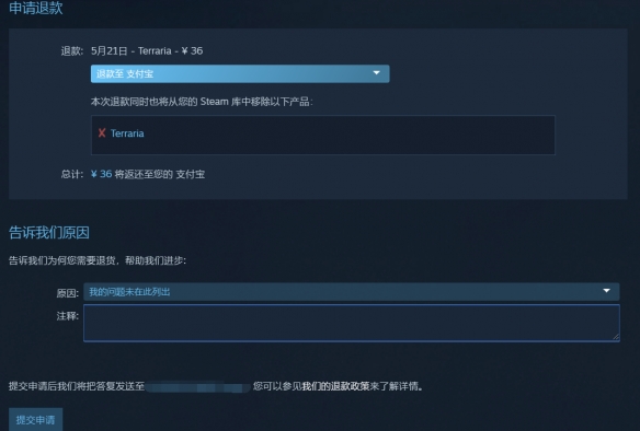 6、填写退款原因后,点击【提交申请】,款项将按原支付方式退回。