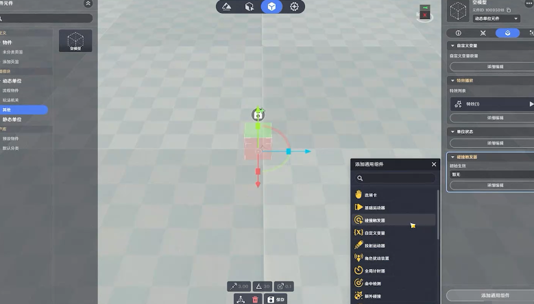5、在页面下方,点击【添加通用组件】,为金币添加一个【碰撞触发器】组件。