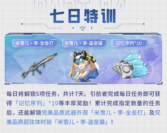 连续七天,每日解锁五项特训任务。完成任务可获得「记忆序列」*10等多样奖励;累计完成指定数量任务后,还能解锁: