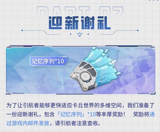为了让各位新入驻的探索者能迅速融入多维空间,官方准备了暖心的「迎新谢礼」,内含「记忆序列」*10等实用奖励。登录游戏后,请留意邮箱查收你的入学见面礼。