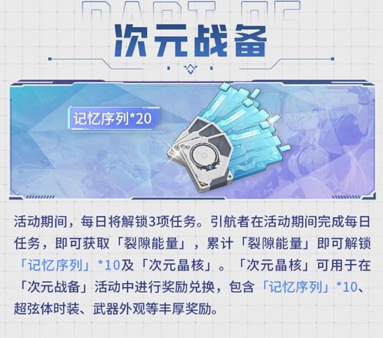 活动期间,每日将开放三项「次元战备」任务。完成任务可获得「裂隙能量」,累积能量即可兑换:
