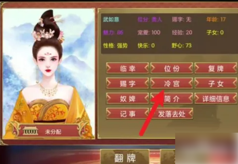 在妃子管理界面中,下方会显示多个操作按钮,其中包括【调动宫位】、【赏赐奖赏】以及关键的【冷宫】选项。