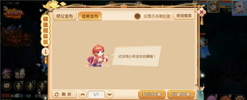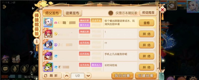 1、在《梦幻西游手游》中,跨服收徒和拜师操作非常简单。玩家只需在师徒招募版发布招募信息即可。想收徒的玩家需要条件优秀才能吸引徒弟,而想拜师的玩家则有更多选择余地。