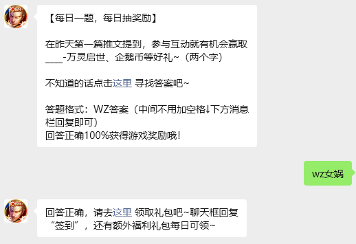 在昨天第一篇推文提到,参与互动就有机会赢取____-万灵启世、企鹅币等好礼~(两个字),玩家只需要回答对今日的问题,即可获取游戏奖励,那么答案到底是什么呢?现在就让指玩手游网的小编为大家带来关于2025《王者荣耀》10月28日每日一题答案介绍的全部内容吧,感兴趣的小伙伴一定不要错过哦。