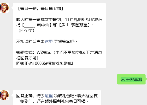 今日问题:昨天的第一篇推文中提到,11月礼册折扣奖池返场【______-画中仙】和【盾山-梦圆繁星】~(四个字)
