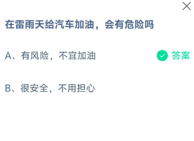 在雷雨天给汽车加油,会有危险吗?这是今天《支付宝》每日一题的问题,相信我们很多用户都很想知道这个问题的答案是什么?这么一个可以领取饲料的机会相信我们很多用户都不想错过,这里指玩手游网的小编为你带来了2025《支付宝》10月31日每日一题最新答案介绍(2)的全部内容,喜欢的小伙伴欢迎点击进入看看吧。