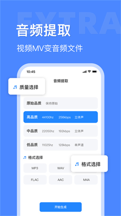 3、音频大师可以从短视频、MVS等文件中提取音乐或语音,快速生成独立的音频文件。